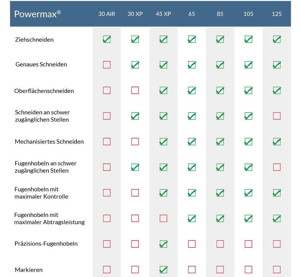 Die untenstehende Tabelle enthält eine Übersicht der Plasmaschneider „Hypertherm Powermax“ sowie der möglichen Anwendungen, an welche sich die erwähnten Geräte anpassen lassen. Sollten Sie Fragen haben, kontaktieren Sie uns bitte. Wir helfen Ihnen gerne bei der Wahl des angemessenen Schneiders, Brenners und von Verbrauchsmaterialien.